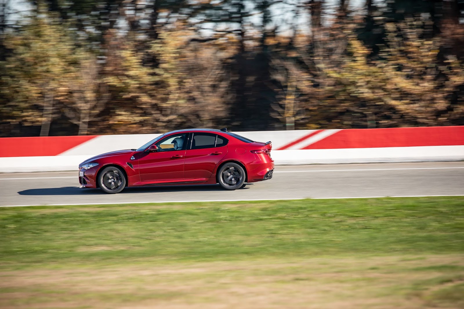Der aufgeladene Benziner-Vierzylinder mag sicherlich nicht das Temperament und diese angenehme Verdorbenheit der QVs haben, jedoch wird auch die Veloce dem Ruf der Familie gerecht und geizt nicht mit Emotionen. Die weniger potent motorisierte Version mag zwar auf der Geraden nicht diese aberwitzigen Zahlen auf dem Tacho rauf- und wieder runterzählen. Jedoch scheint, dass die «kleine» Giulia etwas leichtfüssiger ist, etwas weniger kopflastig und damit noch leichter schnell zu fahren wie die QV. Trotzdem dass auf die QV 230 furiose italienische Pferde fehlen keimt der Wunsch nach mehr Leistung gar nicht auf. Die Veloce tänzelt ebenso gerne, bremst ebenso zuversichtlich und hat dieselbe Stabilität in Kurven und Schikanen. Auch etwas gar überambitionierte Lastwechsel hinterlassen bei der Veloce keine Unruhe und mangelnde Traktion scheint sowieso kein Thema zu sein. Damit war für mich die Veloce tatsächlich die Überraschung des Tages, ein Alfa, welchen ich noch so gerne etwas länger auf dem Track bewegt hätte, wäre dann nicht noch ein letzter Punkt auf der Tagesagenda gestanden...